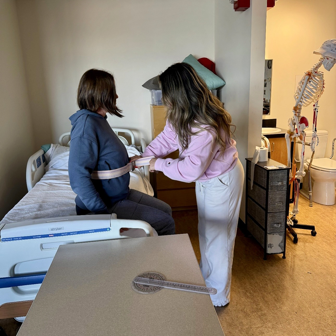 Ayala (on the right) practices using a gait belt to support a seated patient with a fellow OT student.
